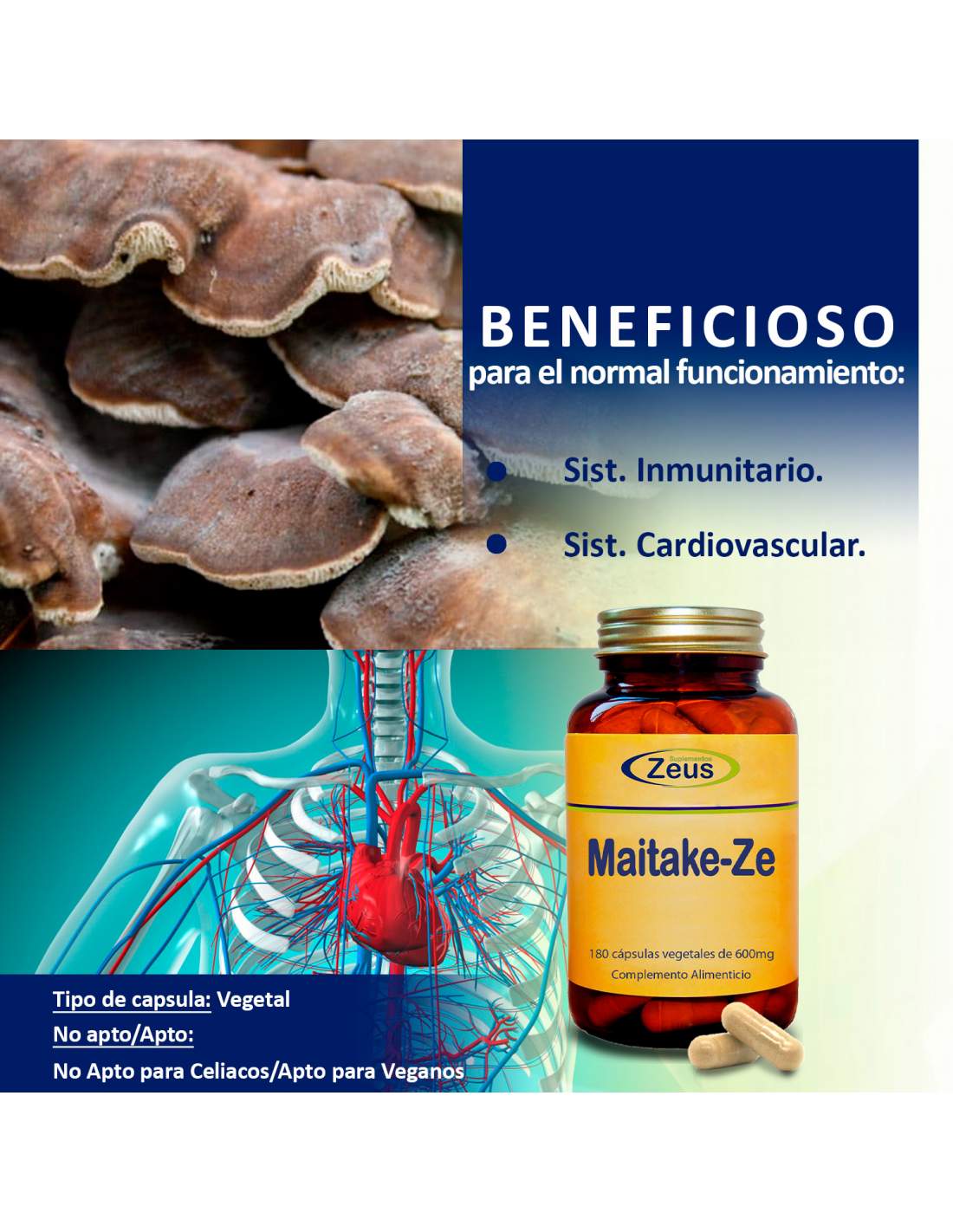 Descripción: Complemento alimenticio a base de Maitake y Vitamina C. El Maitake (Grifola frondosa (Dicks.) Gray) es conocido por tener propiedades antidiabéticas, posee una probada capacidad para regular los niveles de glucosa y estimular la sensibilidad a la insulina. La Vitamina C contribuye al funcionamiento normal del sistema inmunitario.