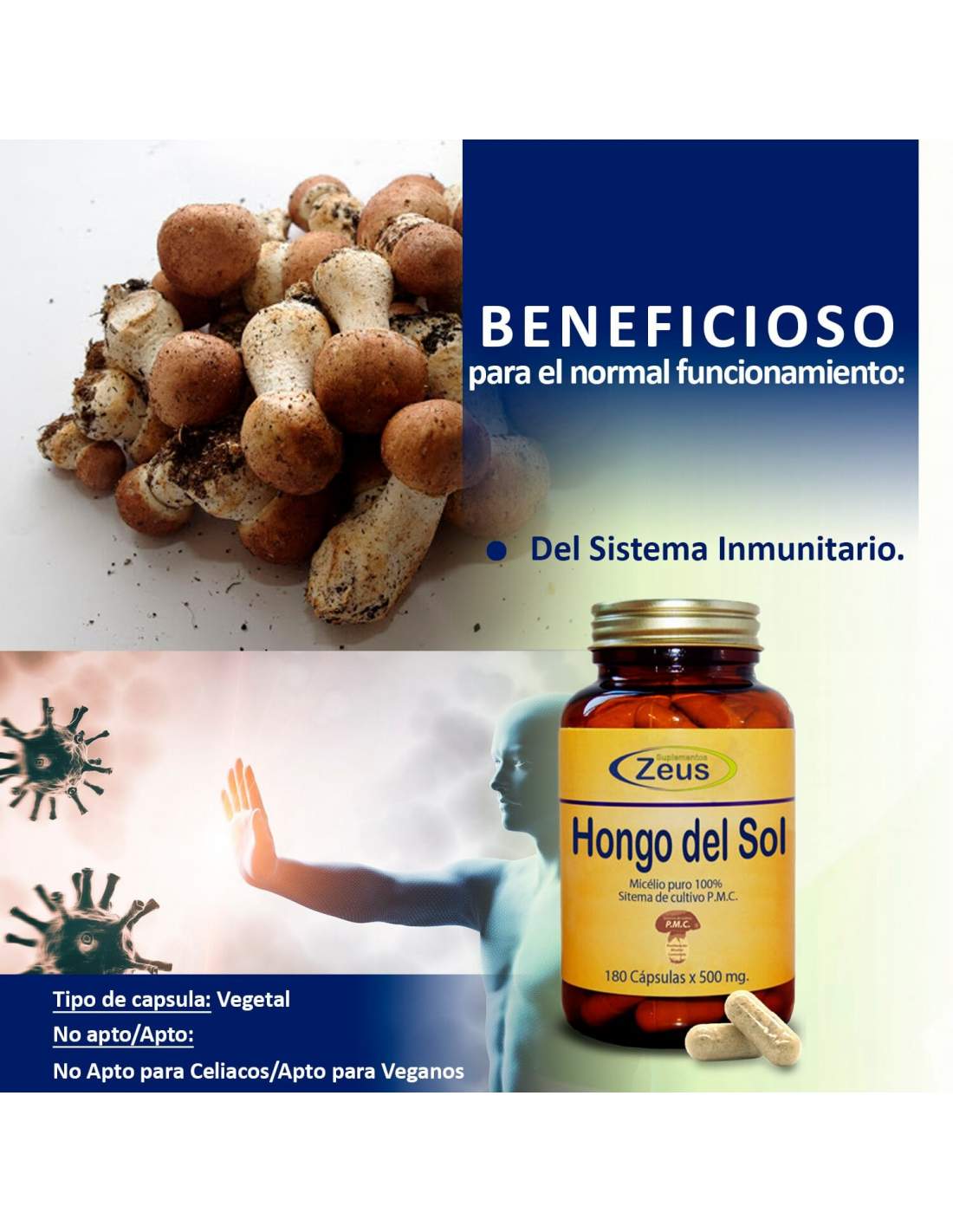 Descripción: Complemento alimenticio a base de Hongo del Sol y Vitamina C. El Hongo del Sol (Agaricus blazei Murill) es conocido por ser un poderoso estimulante del sistema inmunitario promoviendo los mecanismo de defensa natural. La vitamina C contribuye al funcionamiento normal del sistema inmune.