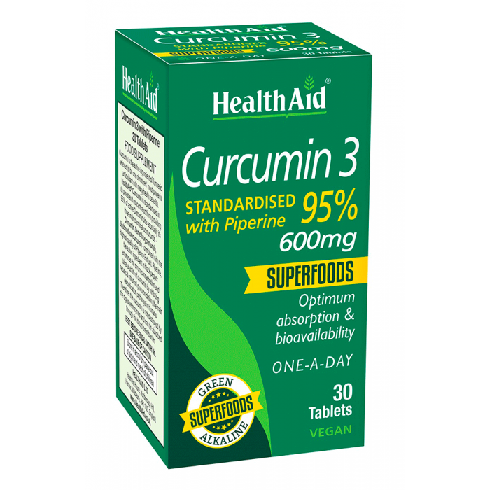 HealthAid® Curcumin 3, procedente de la India, está estandarizado en su forma más pura y concentrada y proporciona un 95% de curcuminoides activos, especialmente sus tres compuestos químicos principales: curcumina, demetoxicurcumina, bisdemetoxicurcumina, combinados con la más alta calidad de extracto de piperina.