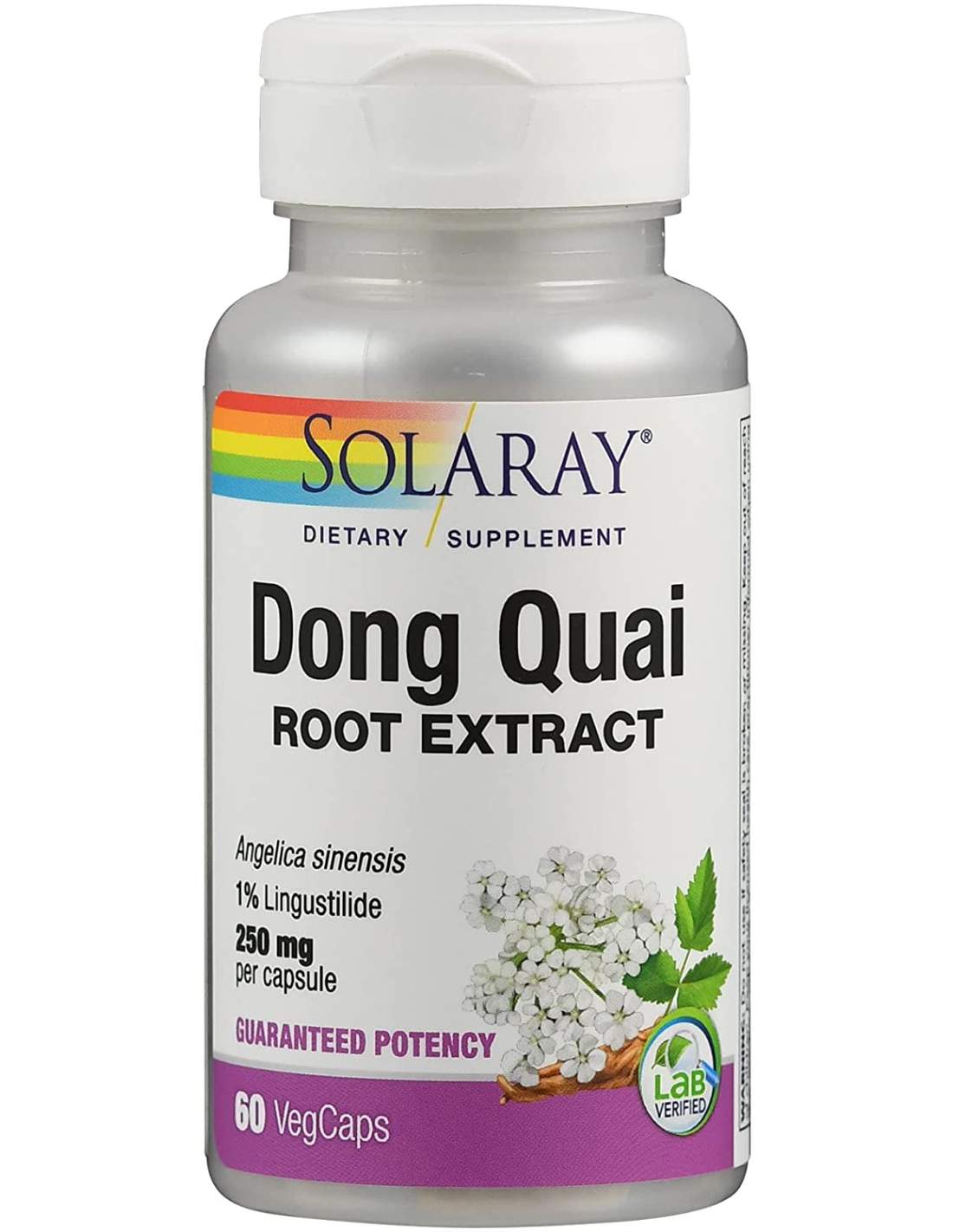 - Dong Quai (Angelica sinensis) 250 mg(extracto de raíz) (garantiza 2.5 mg [1%] lingustilidos)