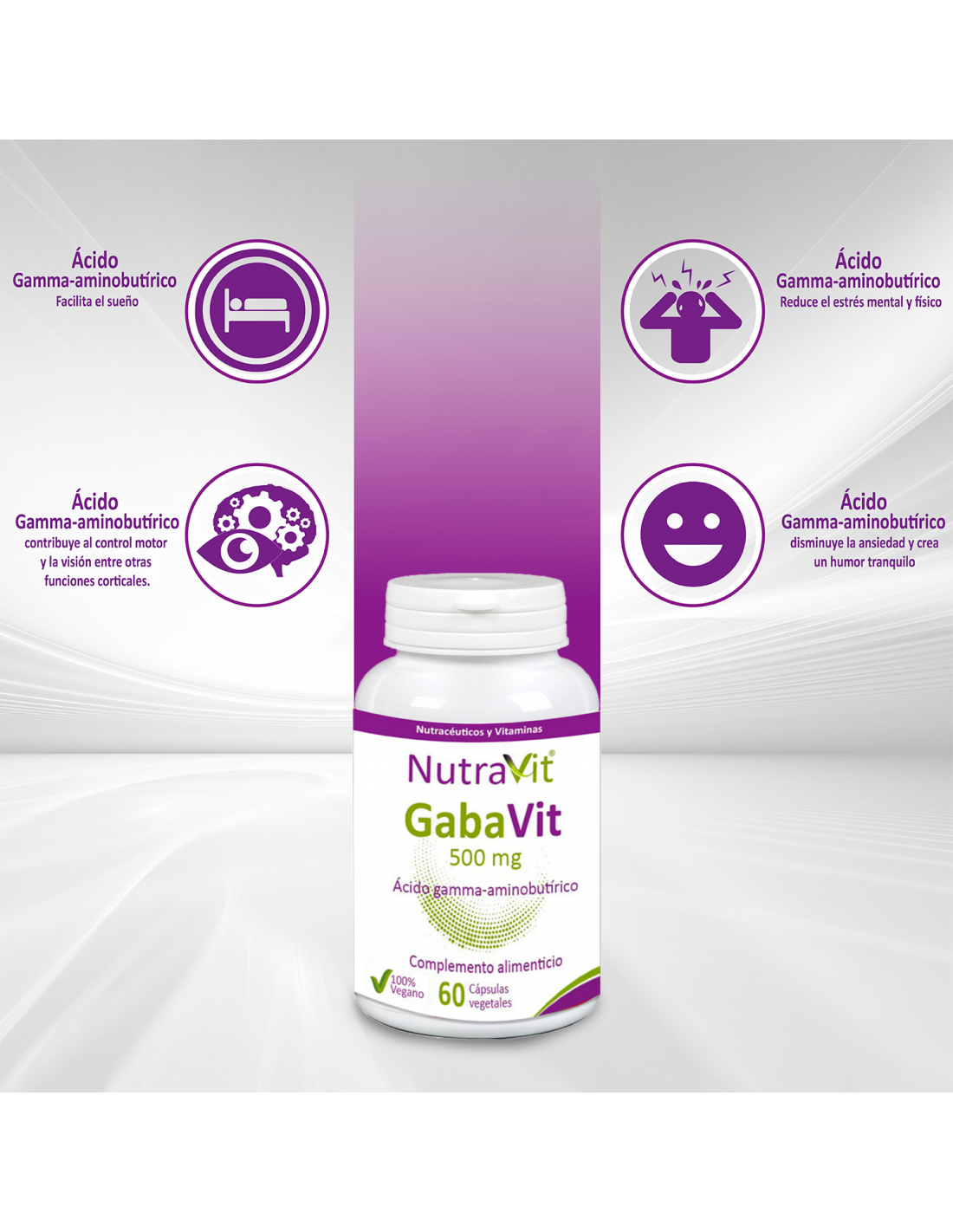 Descripción: El GABA (Ácido gamma-aminobutírico) es un neurotransmisor que facilita el sueño, reduce el estrés mental y físico, disminuye la ansiedad y crea un humor tranquilo; también contribuye al control motor, la visión y regula la ansiedad, entre otras funciones corticales.